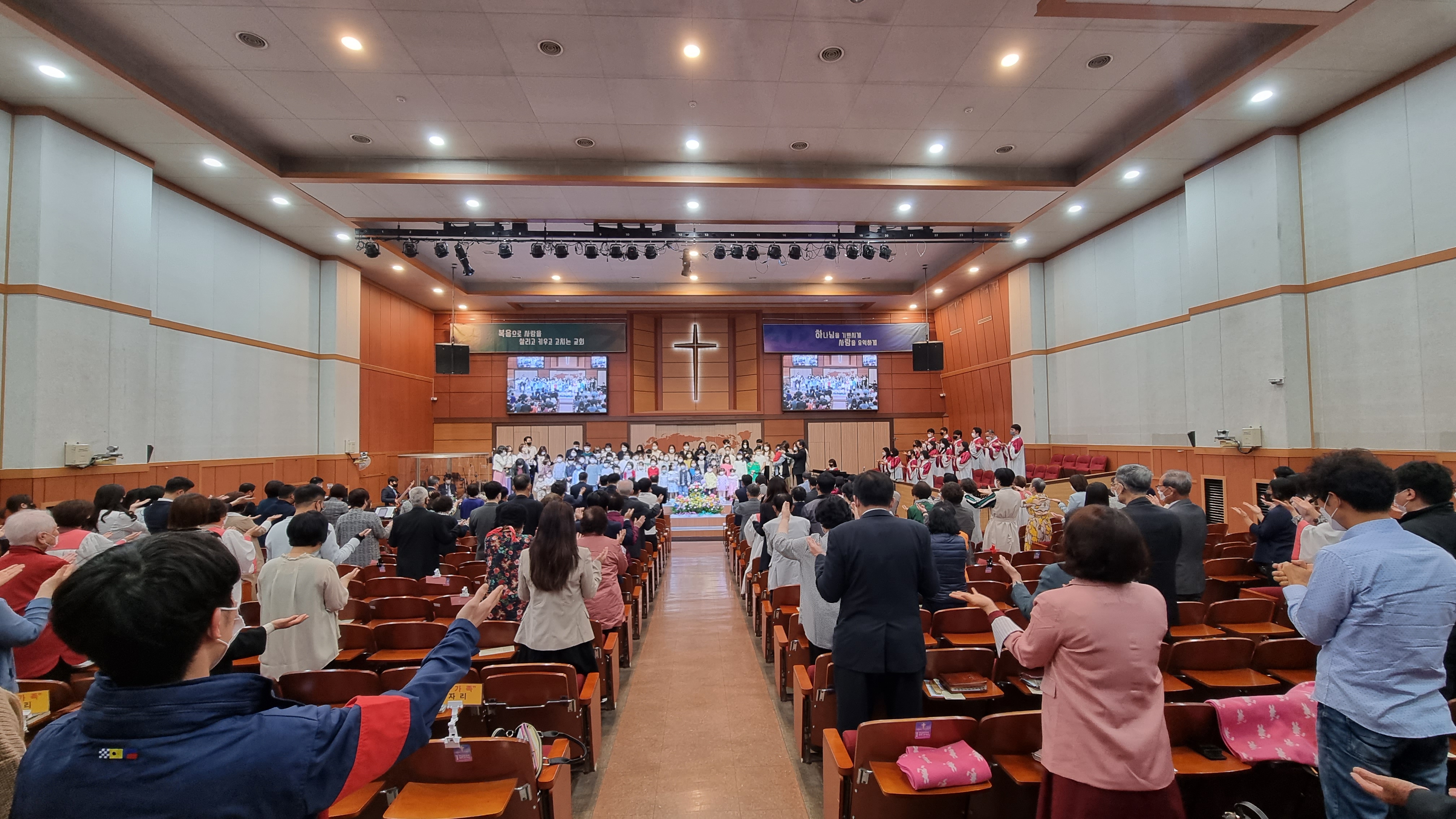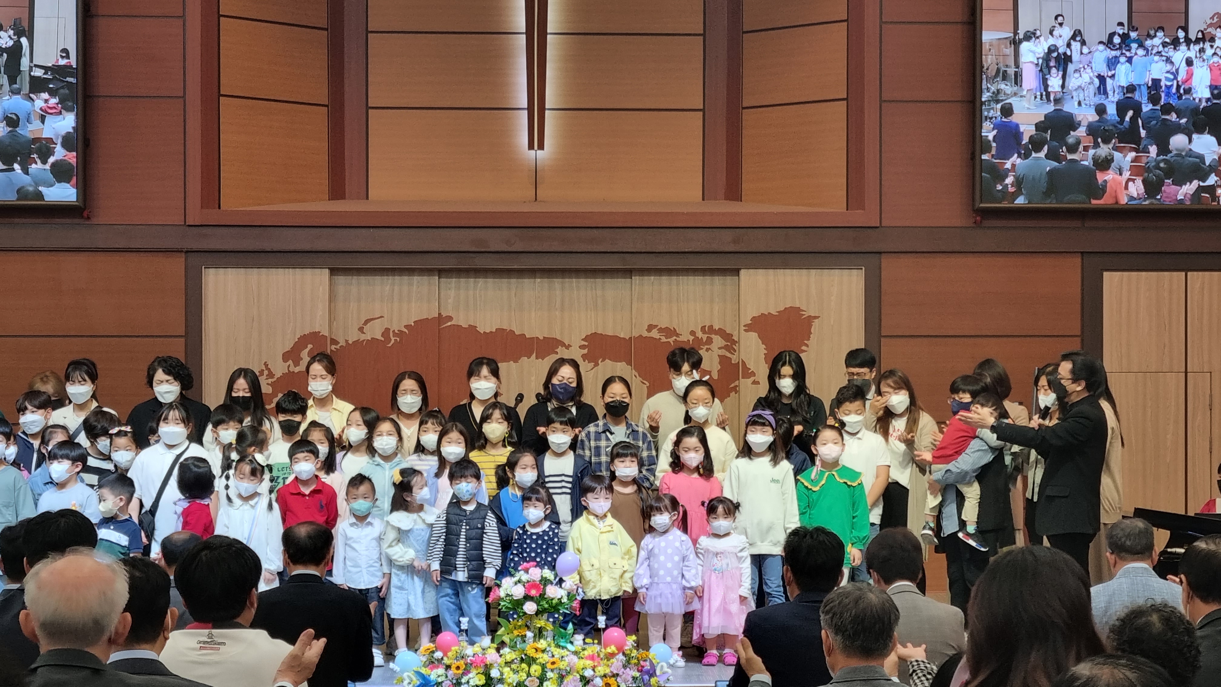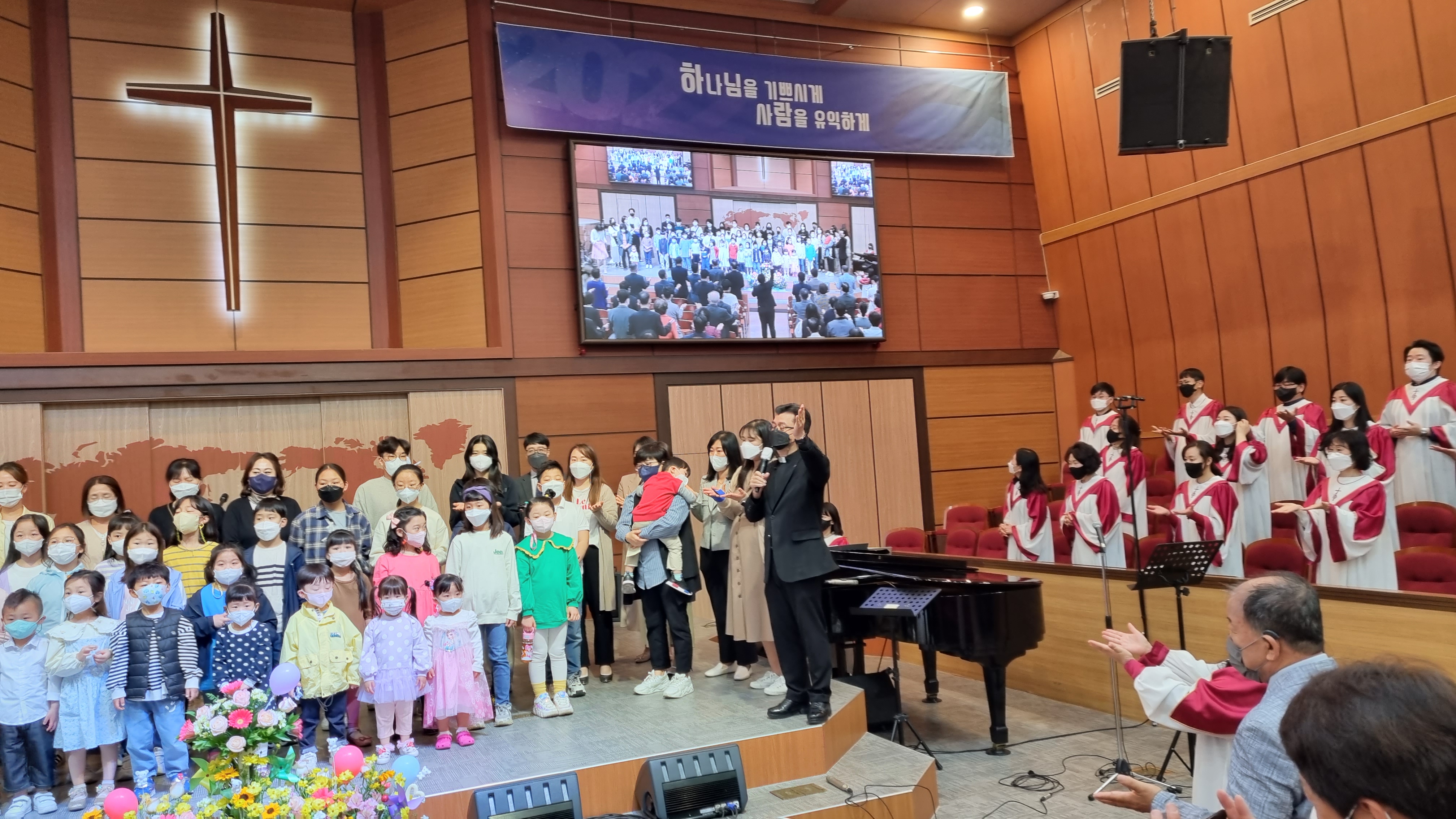 거리두기 해제 후 첫 공식적인 대면예배에 나온 어린이들을 2부예배 시간에 축복하는 모습입니다.