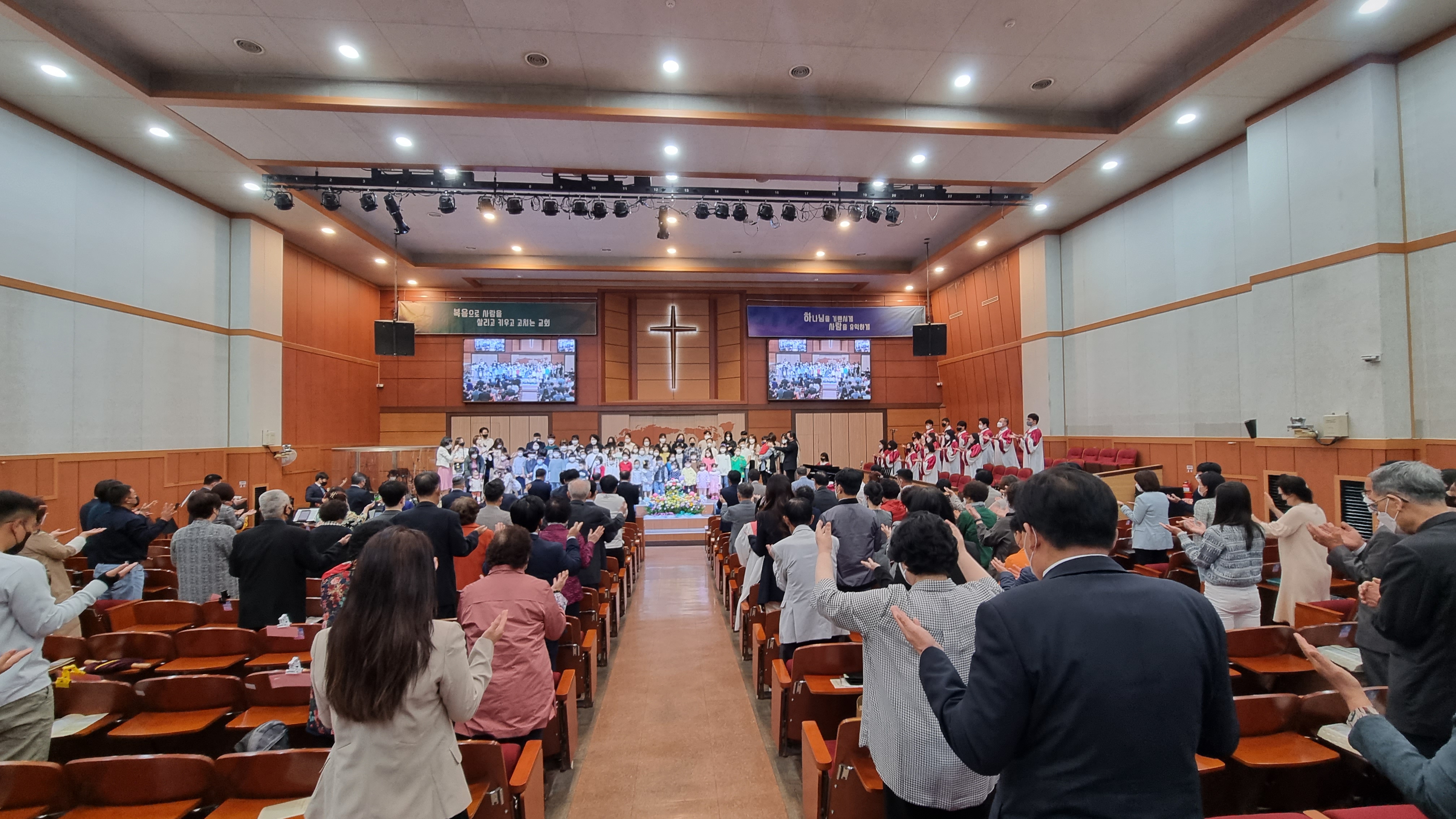거리두기 해제 후 첫 공식적인 대면예배에 나온 어린이들을 2부예배 시간에 축복하는 모습입니다.