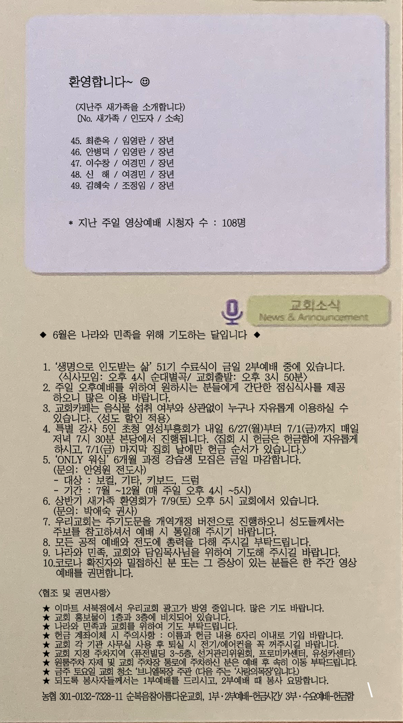 | [주 보|교회소식] 2022.06.12 (0) | 2022.06.11 |