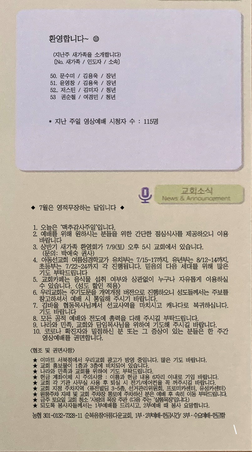 | [주 보|교회소식] 2022.07.10 (0) | 2022.07.09 |