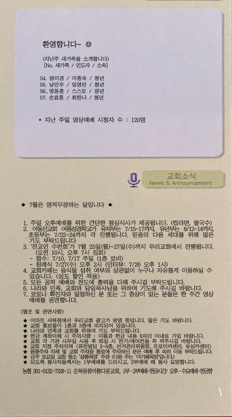 | [주 보|교회소식] 2022.07.17 (0) | 2022.07.16 |