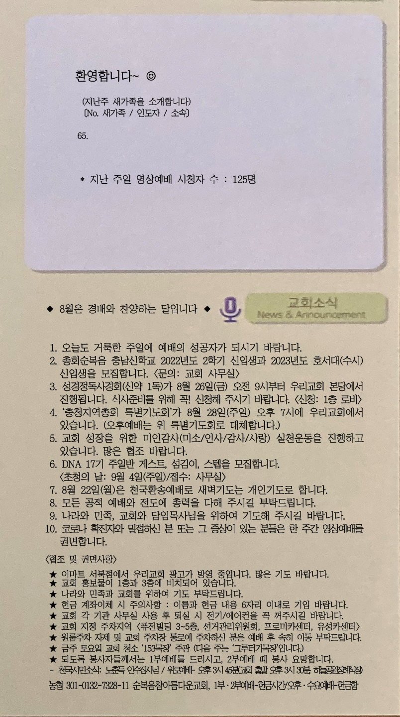 | [주 보|교회소식] 2022.08.07 (0) | 2022.08.06 |