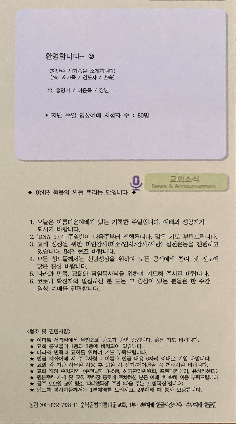 | [주 보|교회소식] 2022.09.04 (0) | 2022.09.03 |