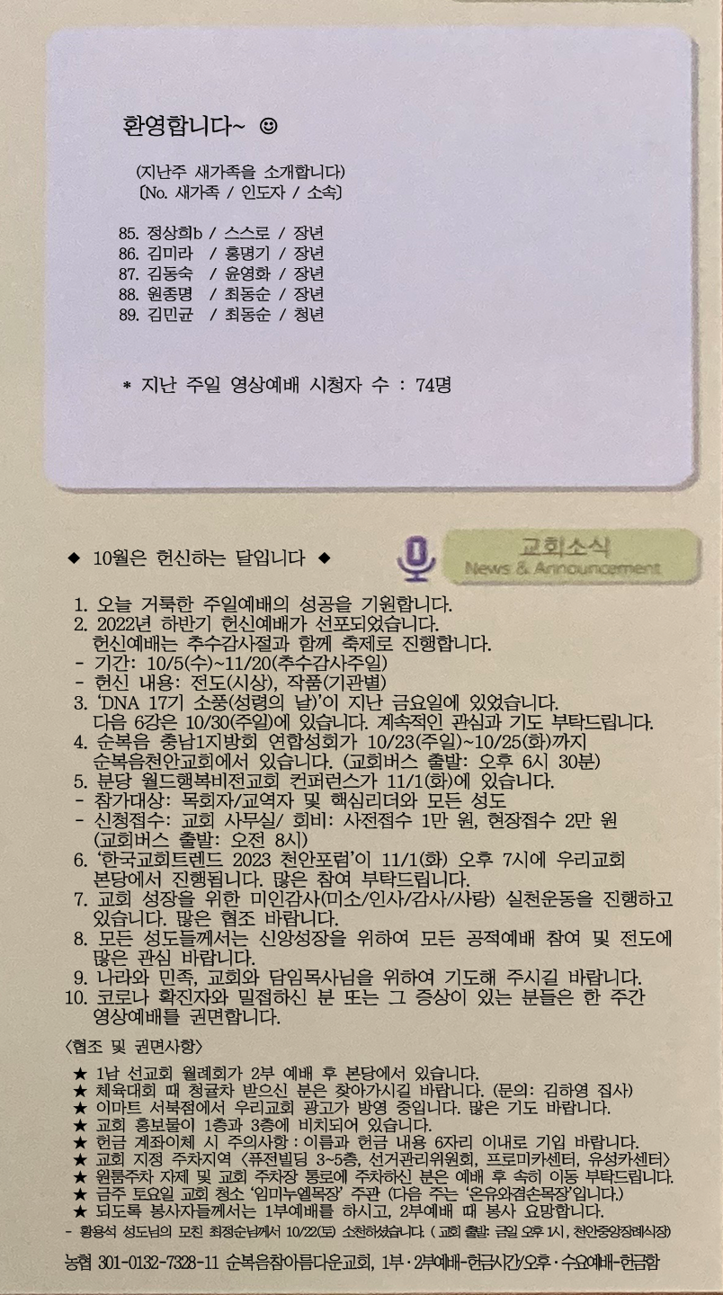 | [주 보|교회소식] 2022.10.09 (0) | 2022.10.08 |
