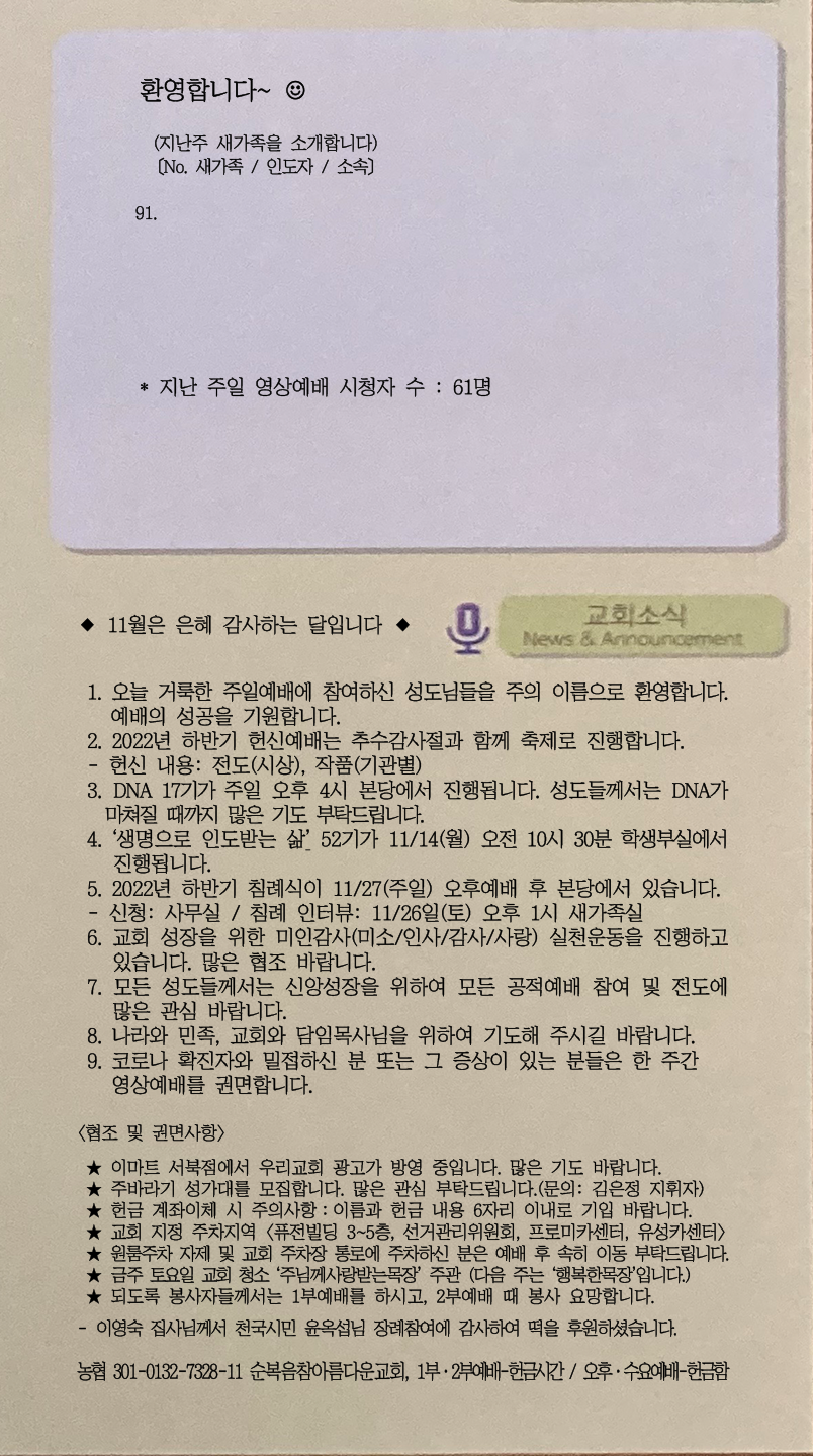 | [주 보|교회소식] 2022.11.27 (0) | 2022.11.26 |