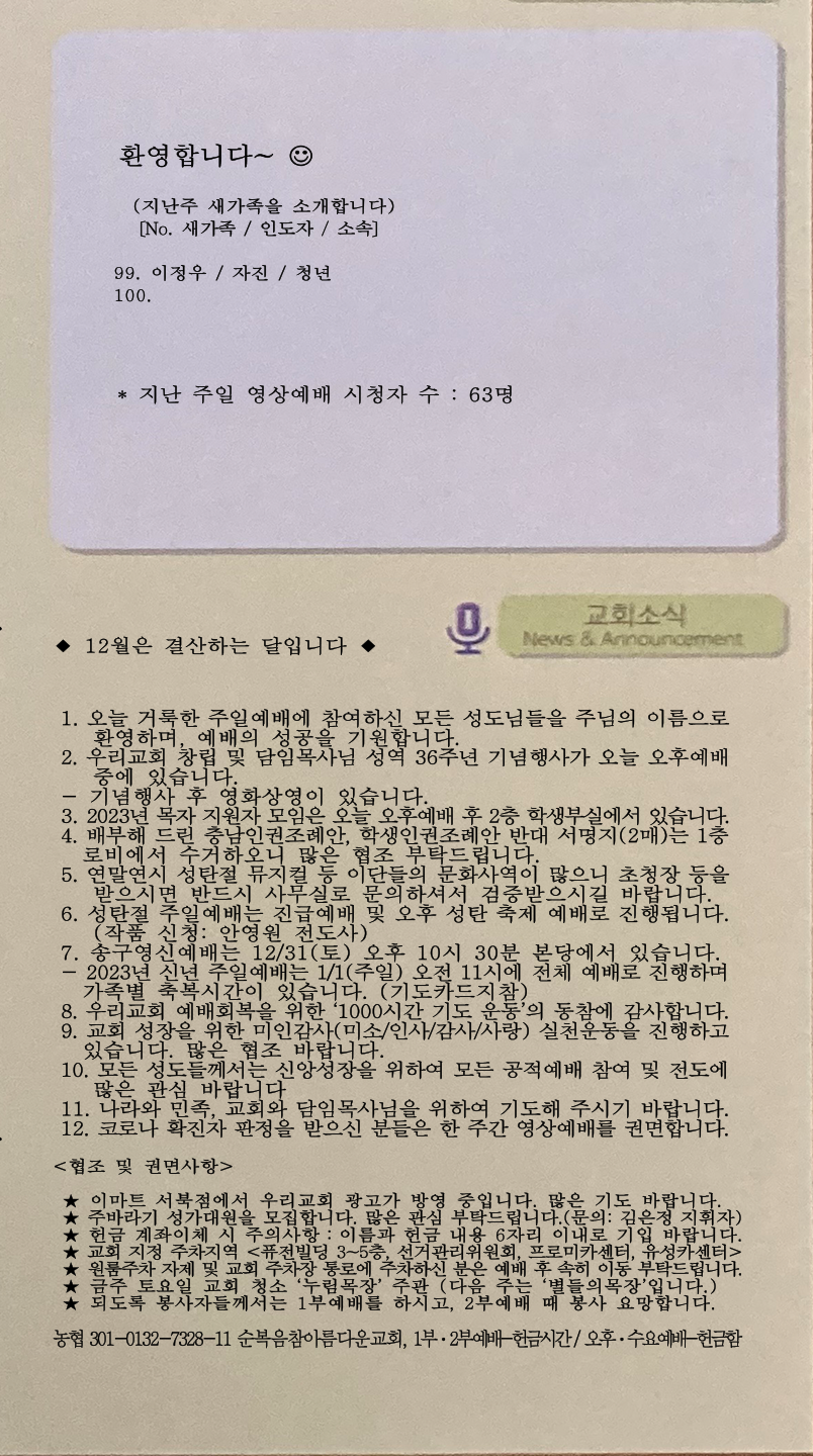 | [주 보|교회소식] 2022.12.11 (0) | 2022.12.10 |