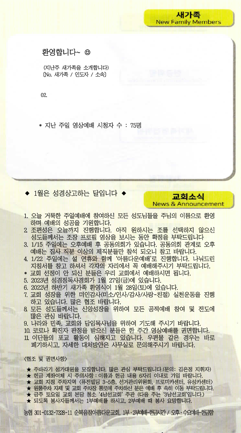 | [주 보|교회소식] 2023.01.15 (0) | 2023.01.14 |
