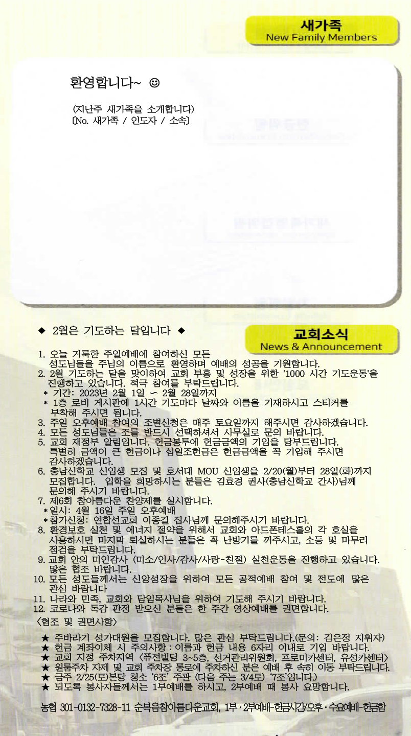 | [주 보|교회소식] 2023.02.05 (0) | 2023.02.04 |