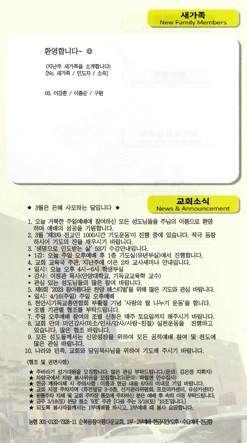 | [주 보|교회소식] 2023.03.26 (0) | 2023.03.25 |
