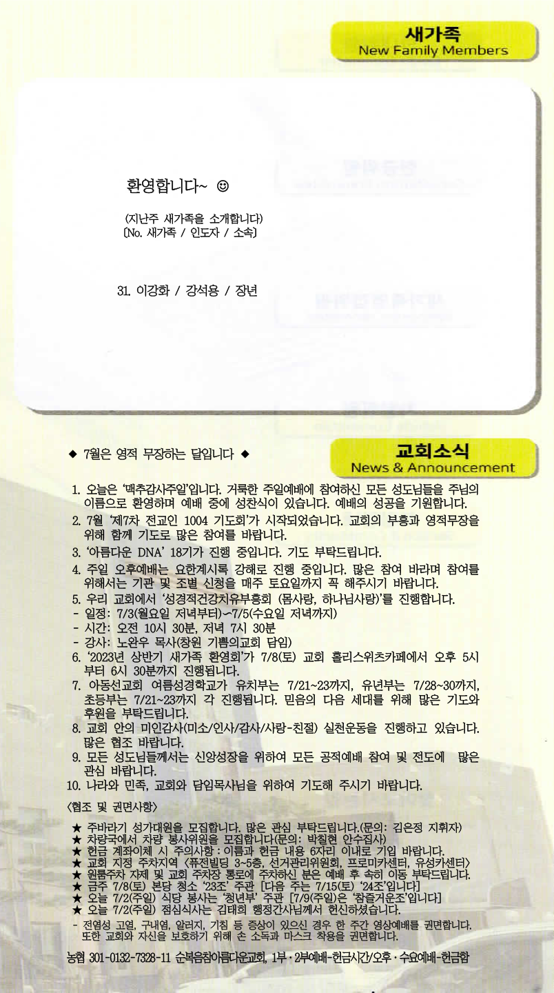 | [주 보|교회소식] 2023.07.16 (0) | 2023.07.15 |