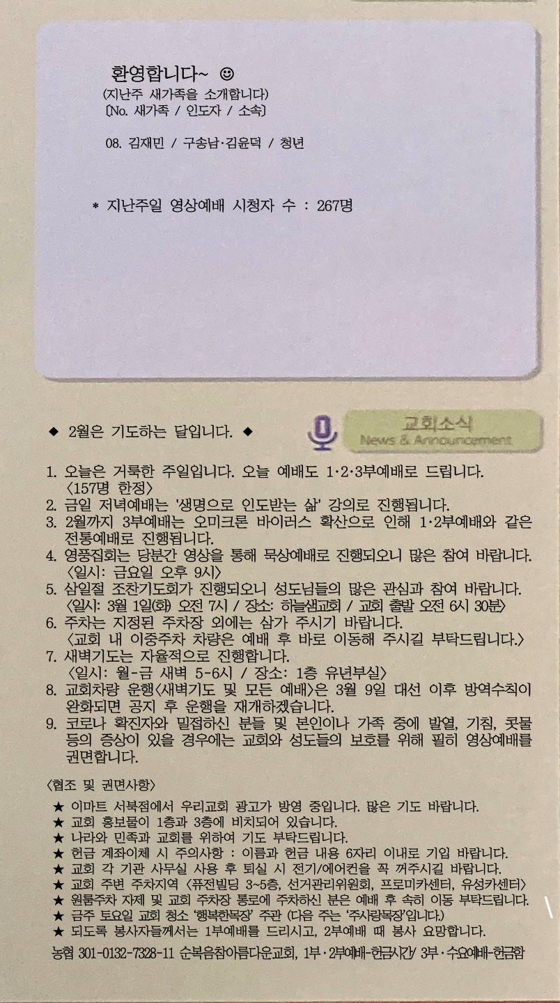 | [주 보|교회소식] 2022.02.27 (0) | 2022.02.26 |