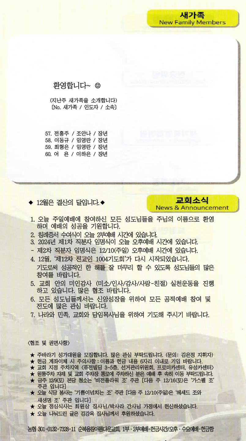 | [주 보|교회소식] 2023.12.10 (0) | 2023.12.09 |