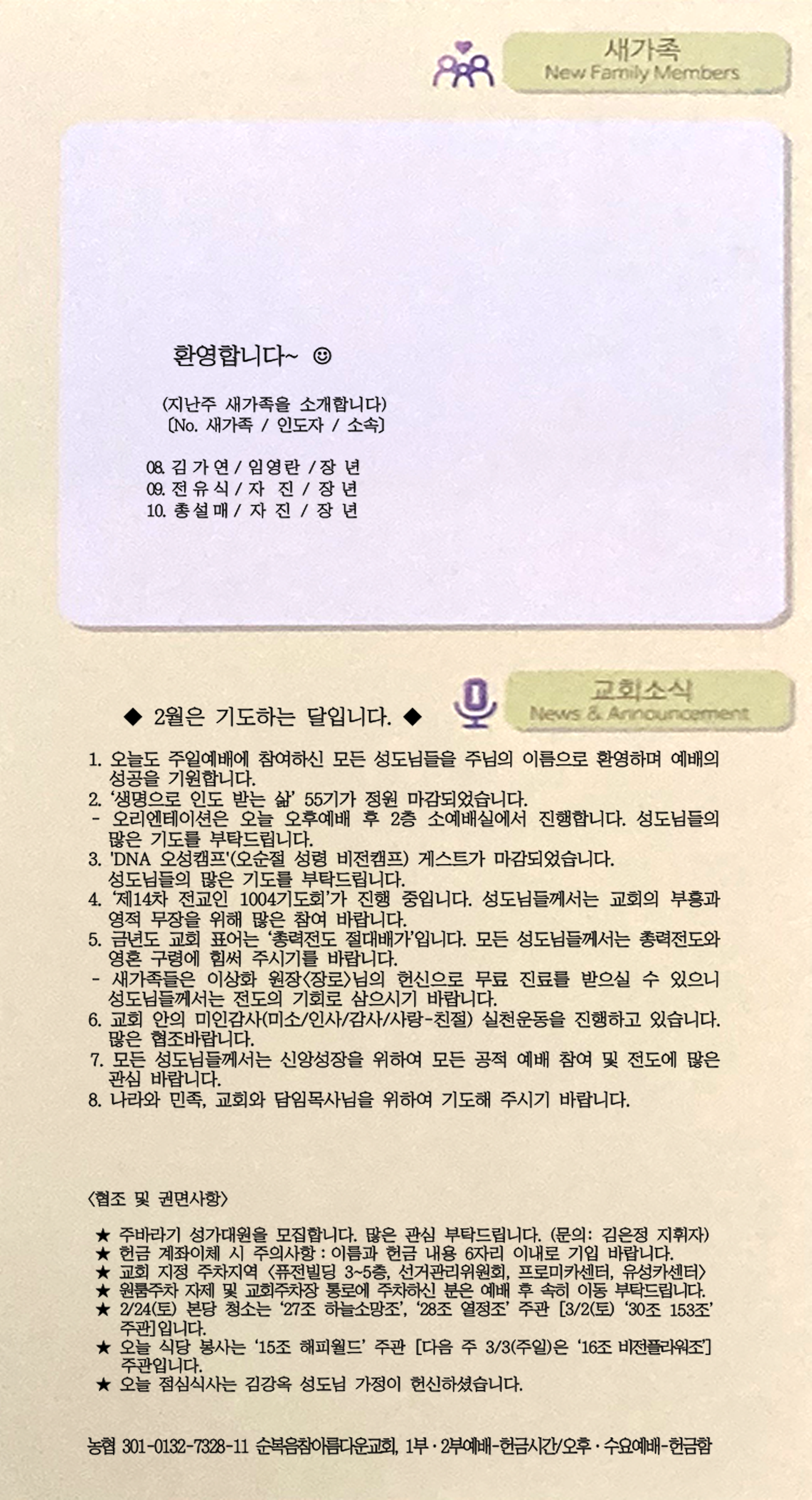 | [주 보|교회소식] 2024.02.04 (0) | 2024.02.03 |