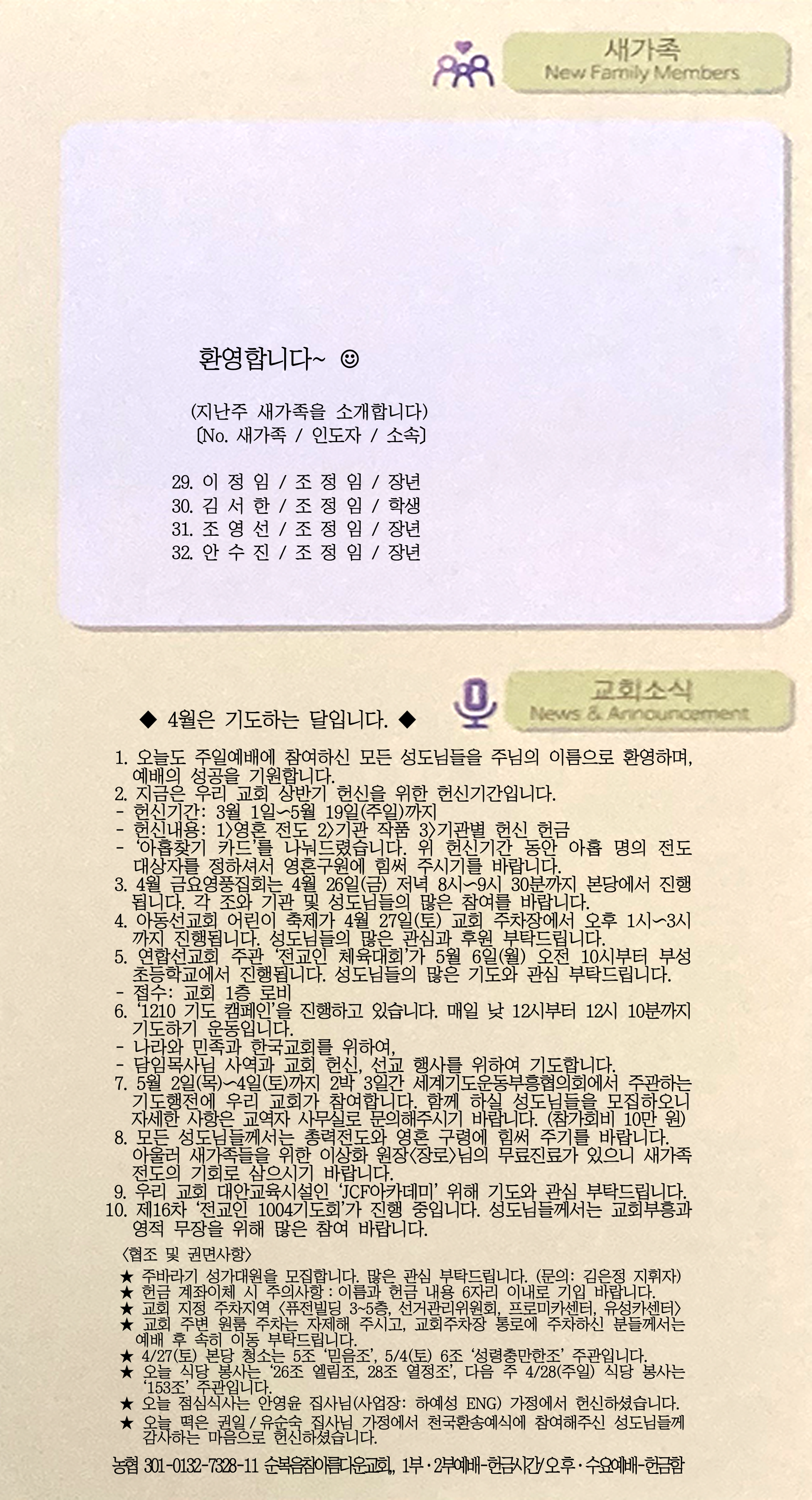 | [주 보|교회소식] 2024.04.07 (0) | 2024.04.06 |