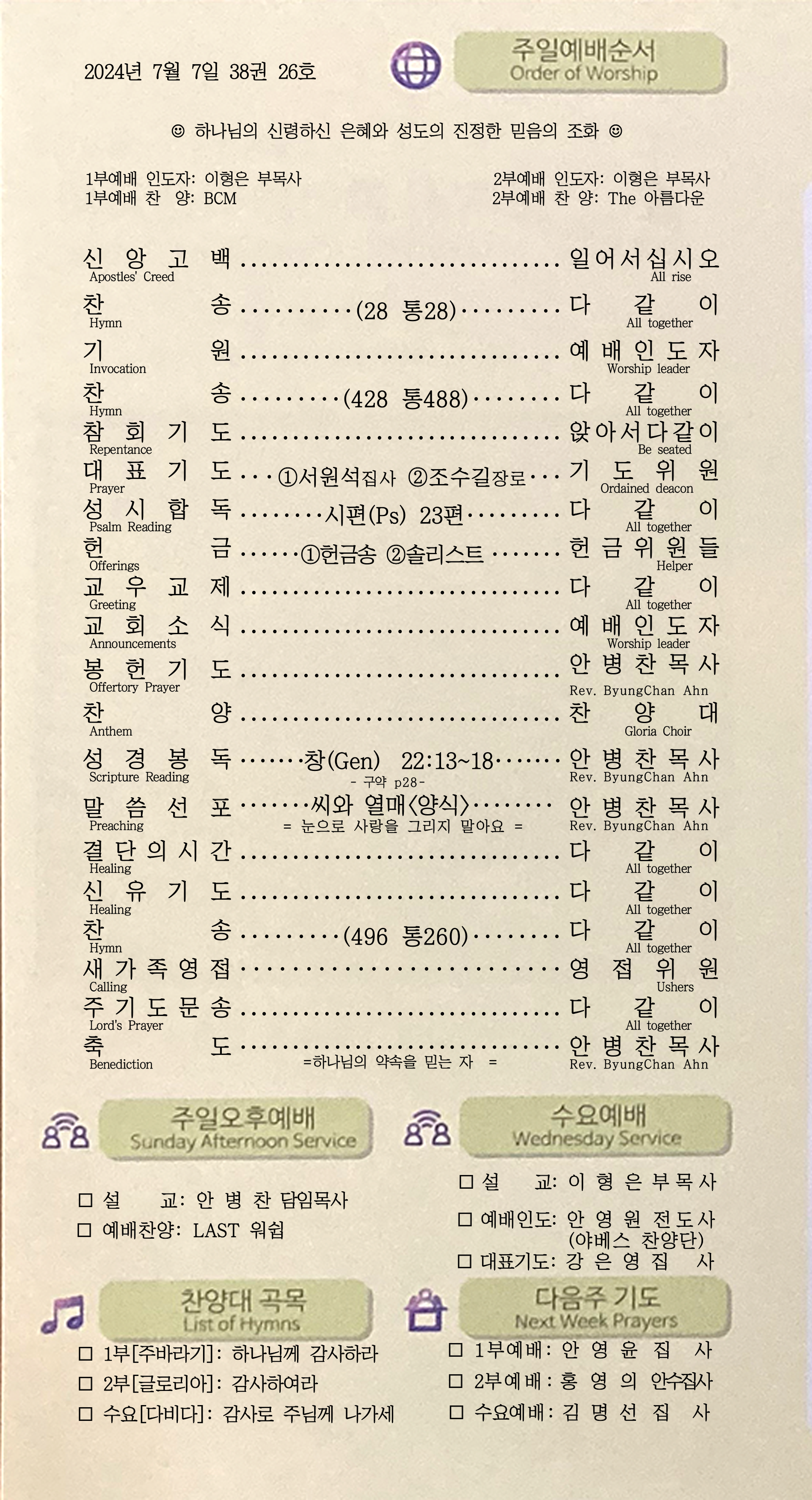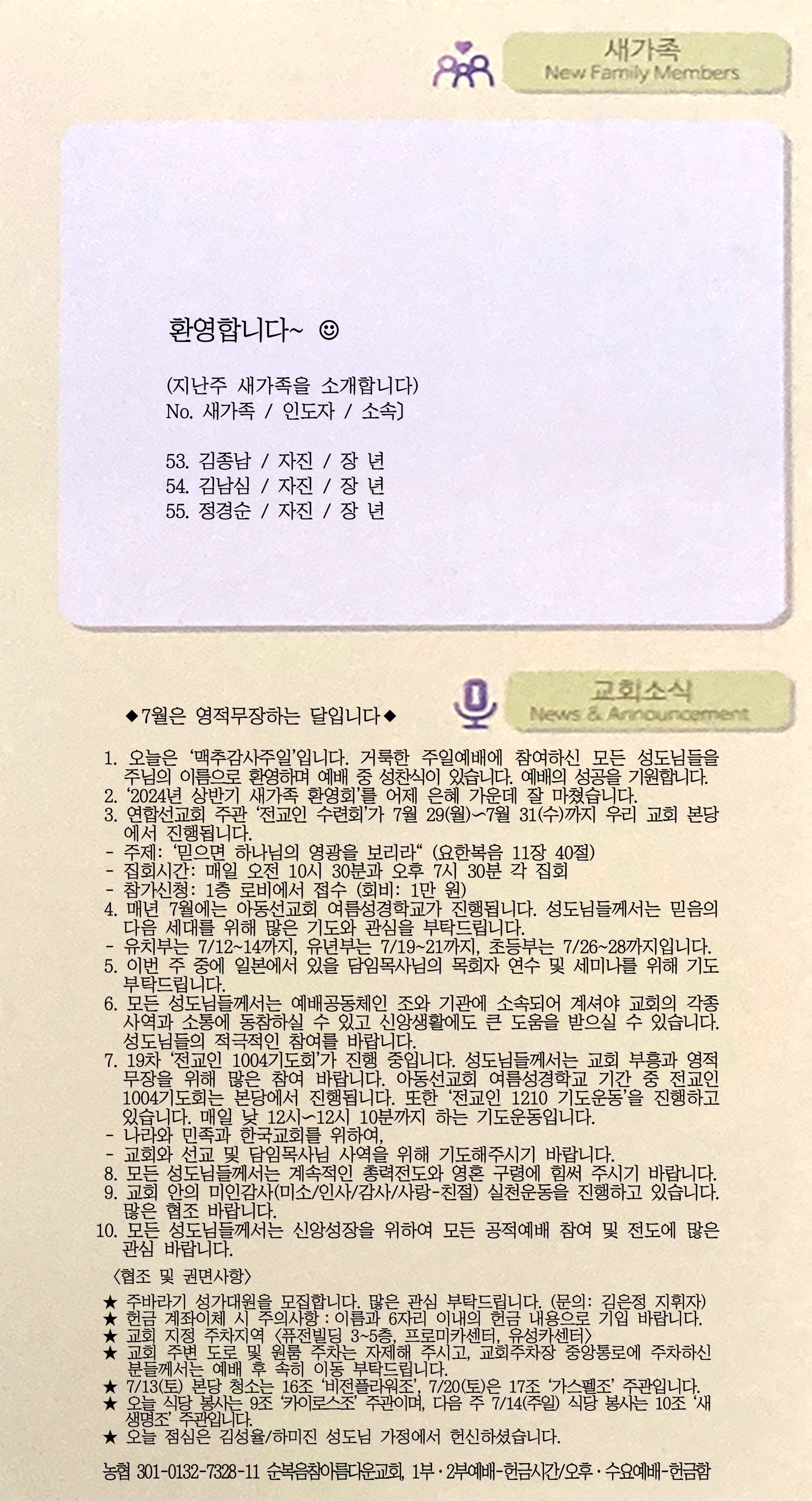 | [주 보|교회소식] 2024.07.14 (0) | 2024.07.14 |