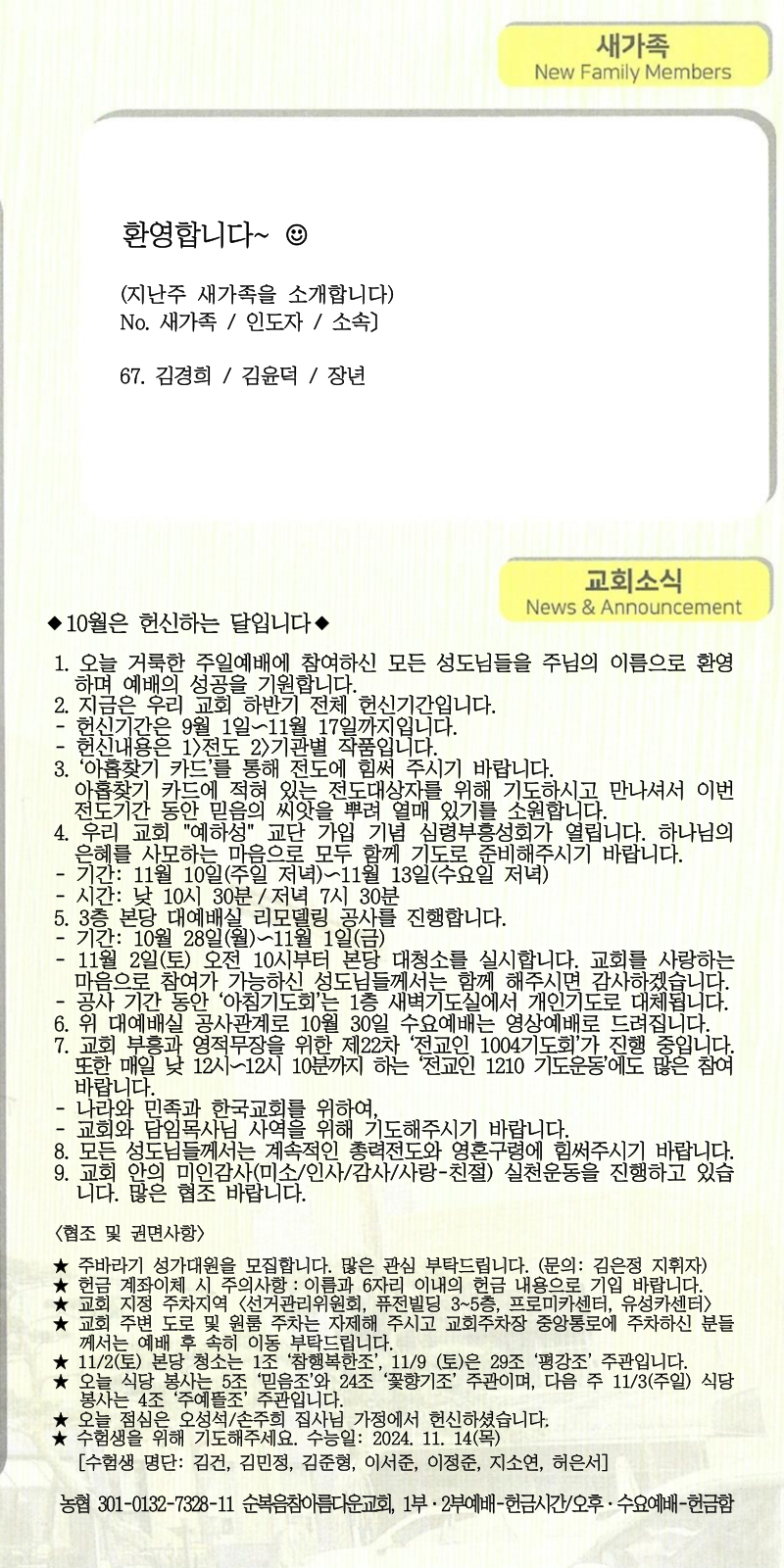 [주 보|교회소식] 2024.10.27