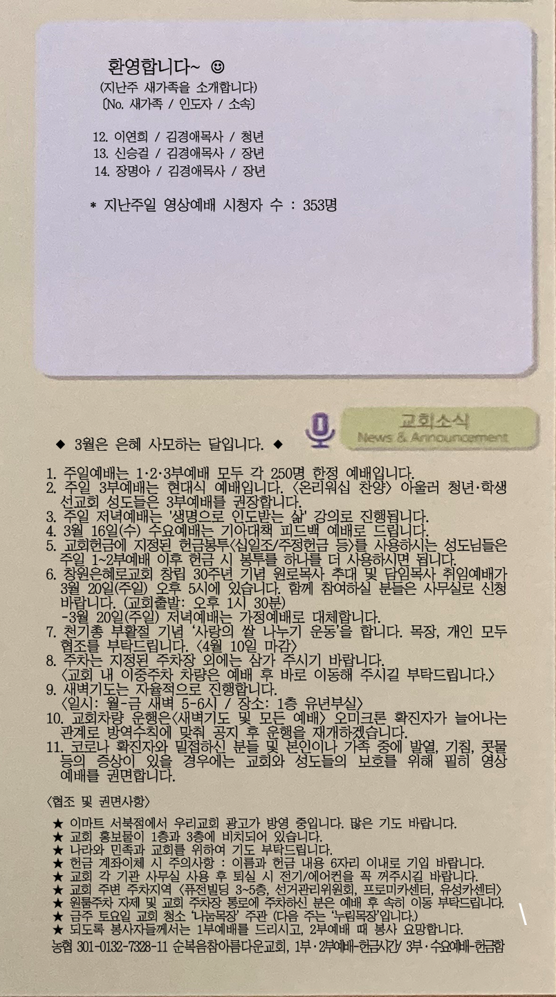 | [주 보|교회소식] 2022.03.06 (0) | 2022.03.05 |