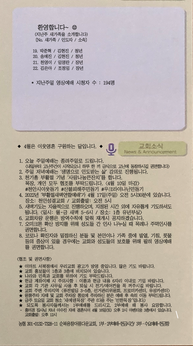 | [주 보|교회소식] 2022.04.17 (0) | 2022.04.16 |