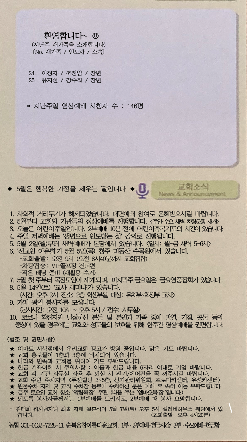 | [주 보|교회소식] 2022.05.08 (0) | 2022.05.07 |